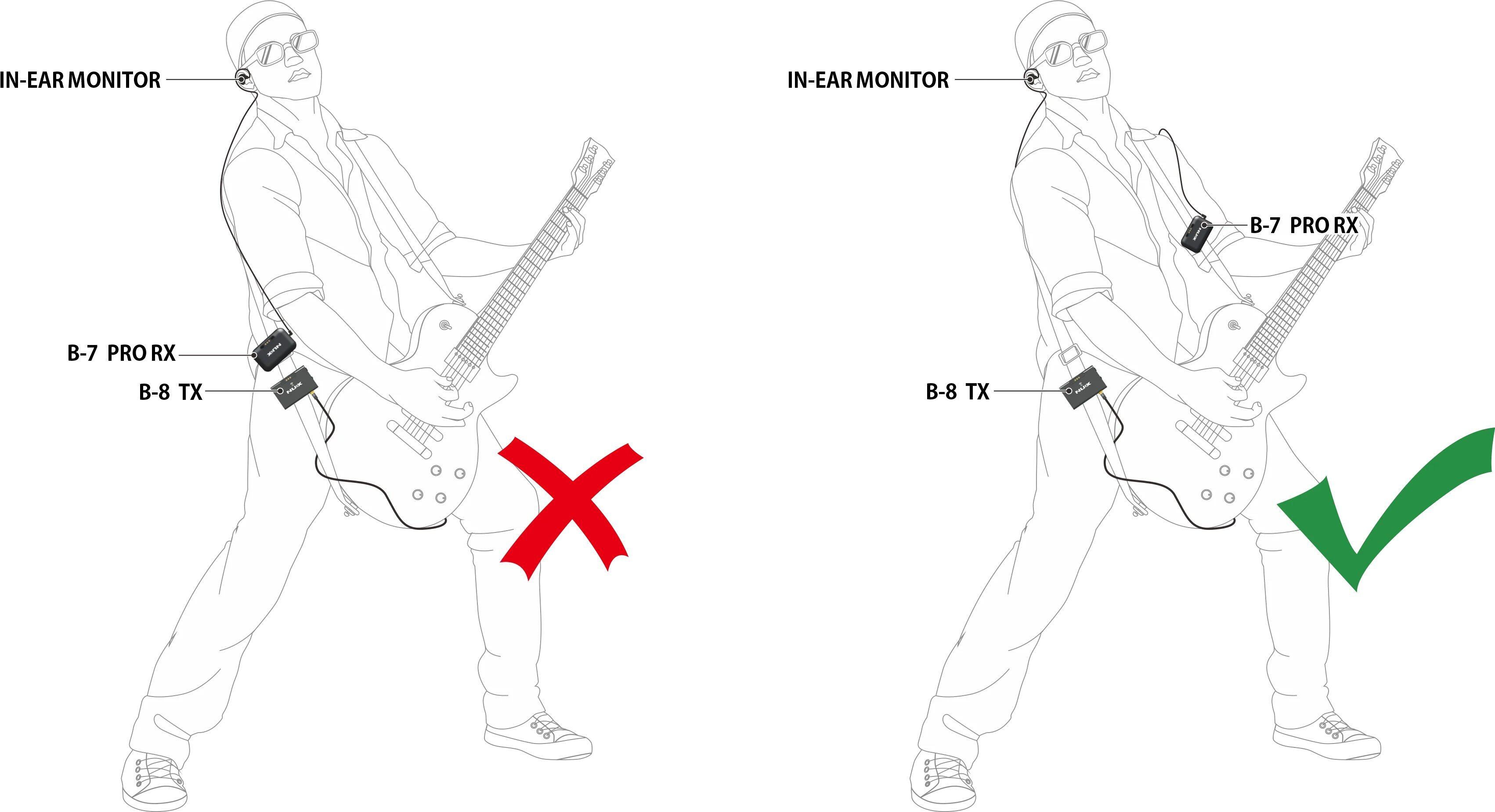 リマインダー:ステージでB-8とB-7 PROを一緒に使用している場合は、干渉の可能性があるため、B-8のTXをB-7 PROのRXに近づけないでください。B-8のTXをストラップに、B-7 PROのRXを体の反対側に配置することができます。これは下の写真に示されています。