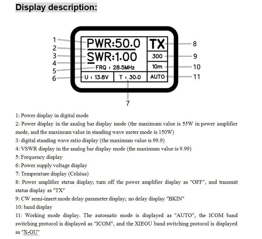 動作モード表示。 「AUTO」は自動モード、「ICOM」はICOMバンドスイッチングプロトコル、「X-GU」はXIEGUバンドスイッチングプロトコルです。