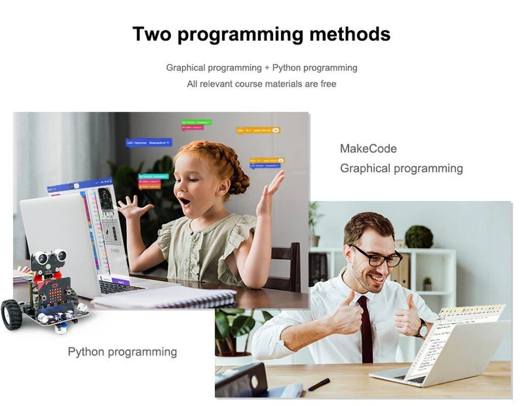 Microbit V2 ロボットは、品質と耐久性の証です。頑丈な金属モーター、高品質のバッテリー、しっかりしたブラケットを備えており、車両が遊びや学習の厳しさに耐えることができます。Microbit V2 ロボットは単なるおもちゃではなく、学習のためのツールです。本体のドットマトリックス画面は創造的な表現のキャンバスとして機能し、Android モバイルアプリのリモートコントローラーはオンボード Bluetooth とシームレスに接続して、リモートコントロールとプログラミングを可能にします。