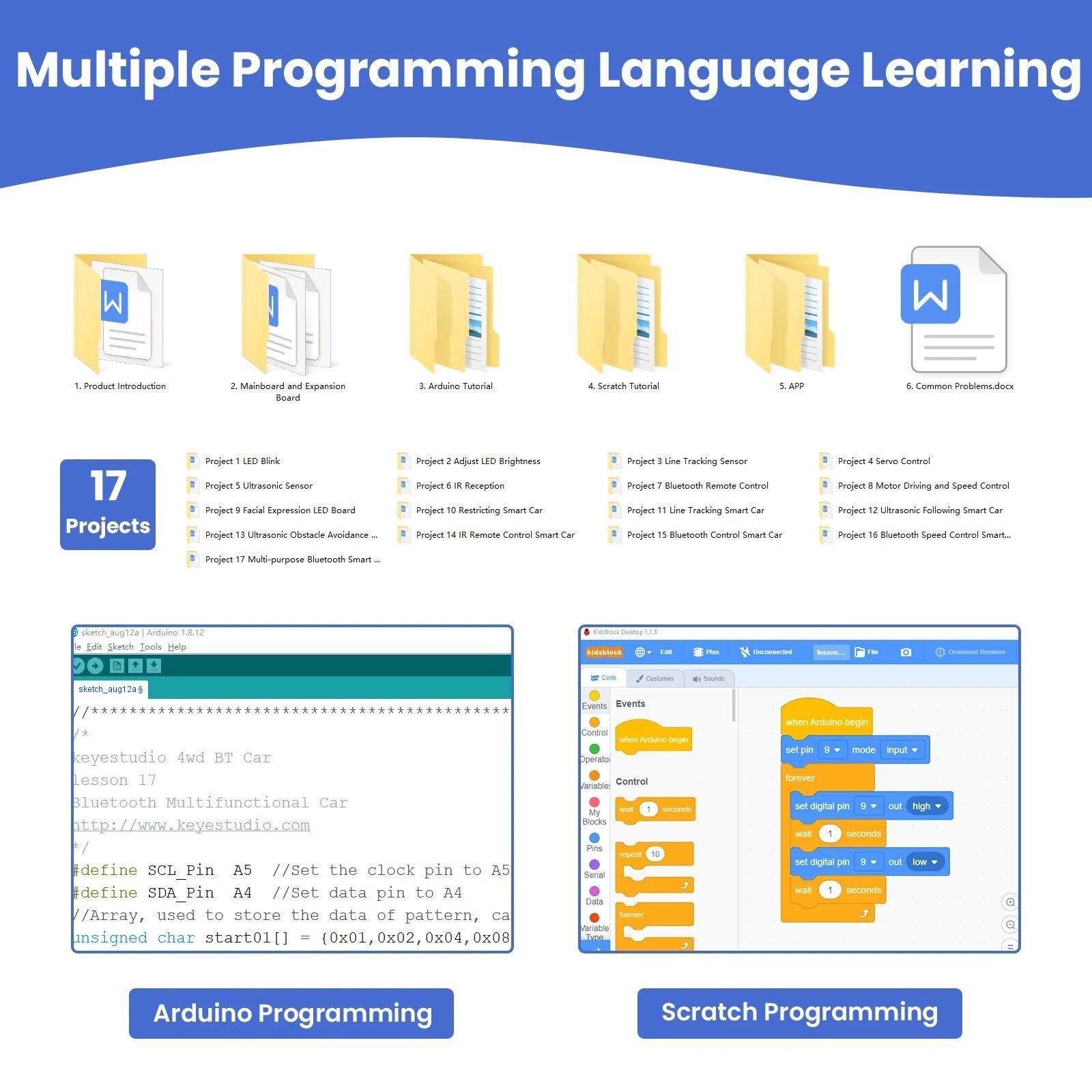 ほとんどのコンポーネントはネジと銅の柱で接続されているため、いくつかの簡単な組み立て手順で独自のロボットを構築できます。さらに、ライントラッキング障害物回避センサー、超音波測距、Bluetooth通信、モータードライバー、IRリモートコントロールなどの基本的な知識も学習できます。この製品には、Arduinoロボットの作成に役立つ、簡単なものから複雑なものまで17の学習プロジェクトが含まれています。