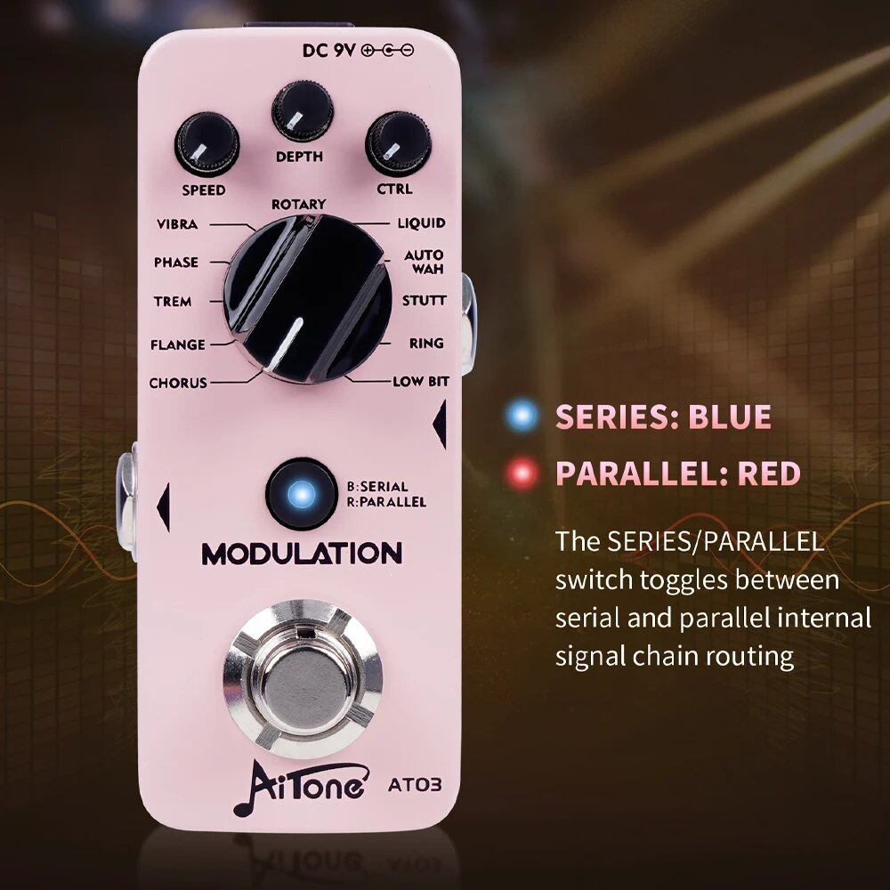 JOYO AITONEシリーズ AT-03エレキギター・モジュレーション・ペダルは、コーラス、フランジャー、トレモロ、フェイザー、ビブラート、ローテーション、リキッド、オートワウ、スタッター、リング、ローバイトなど、11種類の定番モジュレーション・エフェクトを搭載しています。デジタル回路設計により、ノイズ干渉のないクリアな音質を実現します。